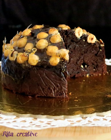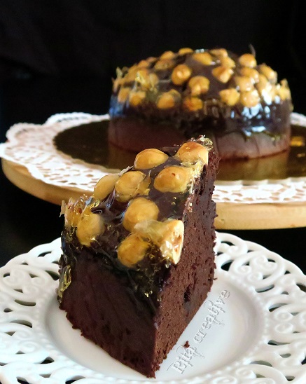 Przepis na murzynek z orzechami i karmelem bez jajek. Ciasto jest mocno czekoladowe, typu brownie, mięciutkie, wilgotne, udekorowane orzechami laskowymi i polane złocistym karmelem. Przepis jest łatwy, szybki w przygotowaniu i bez użycia miksera.